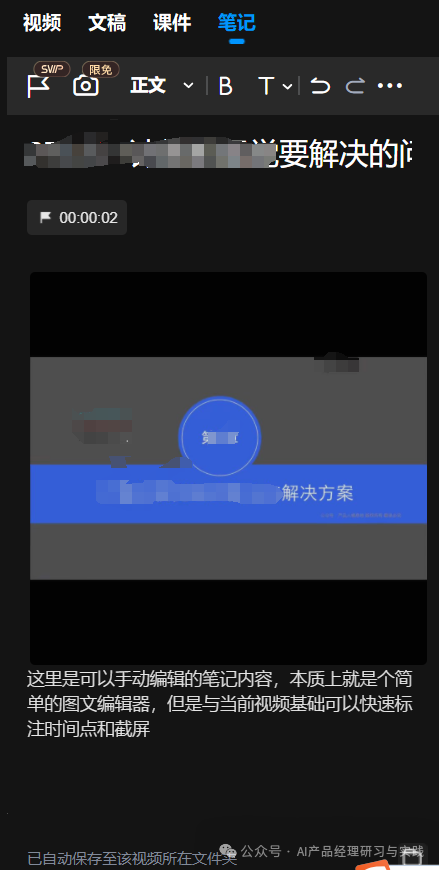 • 时间标记的便捷使用:时间标记功能让用户轻松记录视频中的关键点。当遇到视频中的精彩或重要内容时,一键点击便可将当前的视频时间点添加到笔记中,形成一个时间标记。这些标记不仅在笔记中以图标形式展示,便于快速回访,而且还会在视频的进度条上显示对应的小圆点,直观地指示出标记的位置。点击进度条上的时间标记,笔记将自动打开,并且视频会自动跳转到该时间点,极大地方便了学习和复习。