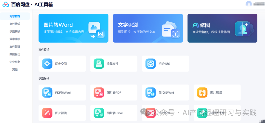在探索的过程中,我发现百度网盘还提供了不少其他非常实用的AI辅助功能或工具支持。尽管这些功能我并不常用,但偶尔有需要时(例如pdf转word)却是求之不得的,这反而是让我惊喜的地方。