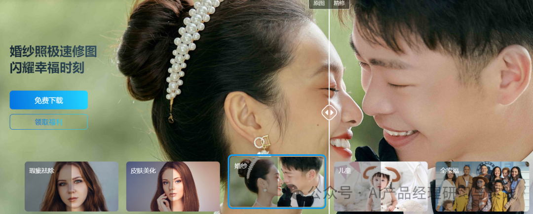 • AI修图:为用户提供简单的图像编辑和优化功能,比如一键美颜、背景替换等,适用于个人和商业用途的图片处理(官方宣传是影楼的专业修图工具,小白秒变后期大师,女生福利呀)。
