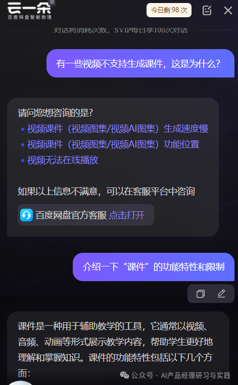 • 对于课件的生成,百度网盘采取了会员等级制度,不同等级的会员享有不同的生成次数,这一设置在一定程度上限制了用户的使用体验(得加钱)。