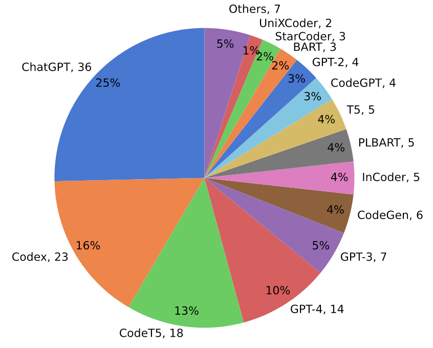进一步地,研究人员还对大模型在各种软件测试任务上的应用进行了详细分析。 以单元测试用例生成为例,单元测试用例生成任务主要涉及为独立的软件或组件单元编写测试用例,以确保它们的正确性。传统的基于搜索、约束或随机的生成技术存在着测试用例覆盖率弱或可读性差的问题。 引入LLM后,相对于传统方法,大模型不仅能够更好地理解领域知识以生成更准确的测试用例,而且还可以理解软件项目和代码上下文的信息,从而生成更全面的测试用例。 对于系统级测试输入,模糊测试作为常用技术,主要围绕着生成无效、意外或随机的测试输入来达到测试的目的,研究人员也详细分析了大模型如何改进传统模糊测试技术。 例如有研究提出通用模糊测试框架Fuzz4All、ChatFuzz等,也有研究专注于特定软件开发基于大模型的模糊测试技术,包括深度学习库、编译器、求解器、移动应用、信息物理系统等。 这些研究的一个关注重点是生成多样化的测试输入,以实现更高的覆盖率,通常通过将变异技术与基于大模型的生成相结合来实现;另一个关注重点是生成可以更早触发错误的测试输入,常见做法是收集历史上触发错误的程序来对大模型进行微调或将其作为演示程序在查询大模型时使用。 论文中对于各种研究的技术思路有更为详细地介绍和比较。 从大模型的视角来看 随后,研究人员再从大模型的视角出发,分析了软件测试任务中选用的大模型,并进一步介绍了如何让大模型适应测试任务,包括提示工程技术、大模型的输入以及与传统测试技术的结合使用。 在所选用的大模型方面,如下图所示,最常用的前三种大模型分别是ChatGPT、Codex和CodeT5。后两种是专门在多种编程语言的代码语料库上训练得到的大模型,能够根据自然语言描述生成完整的代码片段,因此非常适合涉及源代码的测试任务,如测试用例生成、缺陷修复。 此外,虽然已经有14个研究使用GPT-4(排名第四),但是GPT-4作为一种多模态大模型,研究人员表示尚未发现相关研究探索软件测试任务中利用其图像相关功能(例如UI截图、编程演示),这值得在未来研究中探索。(编者注:其实是可以的,编者曾做过相关的实验)