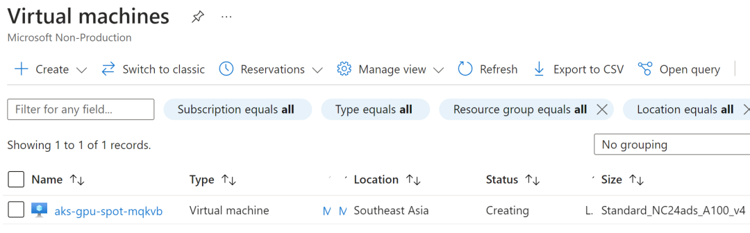 NAME             TYPE                       ZONE              NODE   READY   AGEgpu-spot-57p8w   Standard_NC24ads_A100_v4   southeastasia-2          False   2m18s