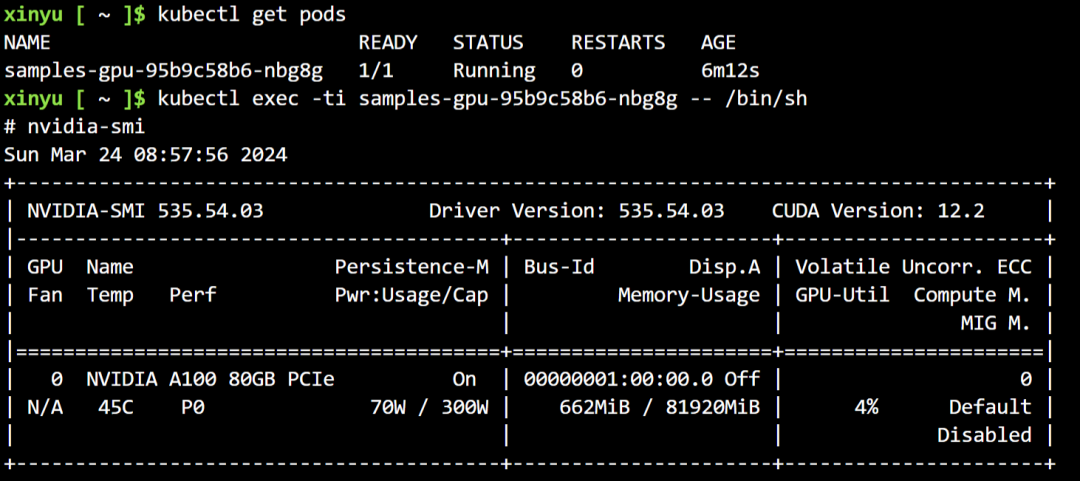xinyu [ ~ ]$ kubectl exec -ti samples-gpu-95b9c58b6-nbg8g -- /bin/sh