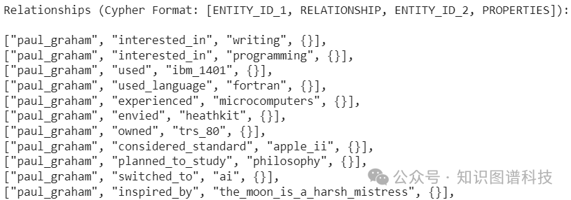 传统上,工程师们必须为每个步骤拼接一系列定制模型的管道。但我选择使用 GPT-4 Turbo 作为单一模型来完成所有任务。我在一个提示中指示模型根据 Paul Graham 的一篇长文创建 KG。以下是创建的 KG 的快照。