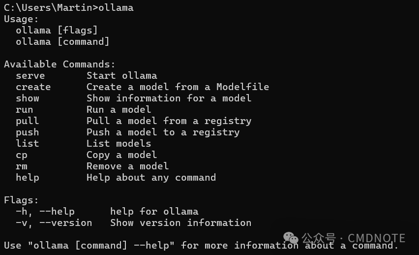 ollama命令,在cmd里输入ollama回车,就能看到ollama的一些基本命令