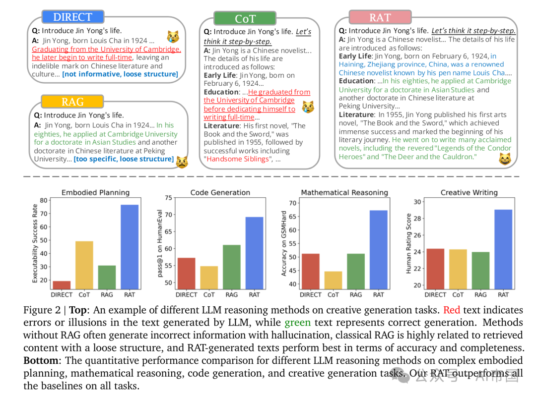 LLM在各种自然语言推理任务上取得了丰硕的进展,尤其是在结合大模型和精心设计的提示策略时。然而,人们越来越关注LLM推理的事实正确性,引用模型响应或中间推理路径可能出现的幻觉。当涉及zero-shot CoT提示(即"让论文一步步思考")和需要多步且需要背景感知推理的长期生成任务时,这个问题变得更加严重,包括代码生成、任务规划、数学推理等。事实有效的中间思路对于成功完成这些任务至关重要。 已提出了几种提示技术来缓解这一问题,其中一个有前景的方向是检索增强生成(RAG),它从人类推理中获取见解,并利用检索到的信息来促进更加基于事实的推理。在本文中,论文探讨如何将RAG与精心设计的长期推理相结合。论文的直觉是,在中间推理过程中的幻觉可以通过外部知识的帮助得到缓解。由此产生的提示策略称为检索增强思维(RAT),如图1所示。论文的策略包括两个关键想法。 首先,LLM产生的初始zero-shotCoT以及原始任务提示将被用作查询,以检索可能有助于修订可能存在缺陷的CoT的信息。其次,论文设计了一种逐步方法,而不是一次性检索和修订整个CoT并生成最终响应。LLM按照CoT(一系列子任务)一步步生成响应,仅根据使用任务提示、当前和过去的CoT检索到的信息来修订当前思维步骤。这种策略可以类比于人类推理过程:在解决复杂的长期问题时,论文利用外部知识来调整逐步思考。RAT与其他方法的比较可以在图2中找到。