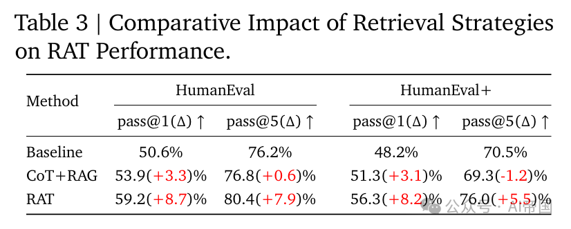 RAT检索的消融研究。在这项消融研究中,论文调查了各种检索策略对RAT的有效性的影响,重点是优化内容检索以改进生成输出。表3中详细的实验结果凸显了RAT通过迭代式优化检索查询相比基线方法取得了显著进步。标记为RAG-1的基线采用直接的方法,使用问题本身作为检索查询。相比之下,CoT+RAG通过利用语言模型输出的整个推理思路作为查询来增强这一过程,旨在获得更广泛的上下文理解。然而,RAT引入了一种更动态的方法,使用不断修改的推理思路部分作为查询,这允许进行更加专注和相关的信息检索过程。