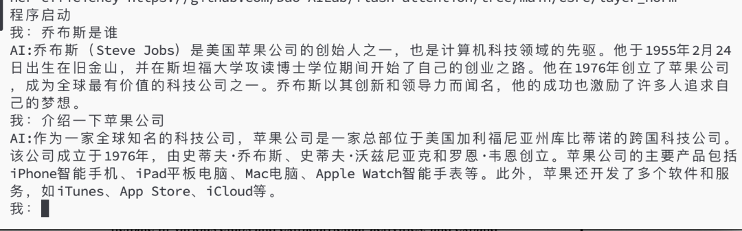其实通过上面这几个Loss图,就能看出大模型的训练都遵循scaling law的原则,图的走向基本都是那样的,所以这次实践让我更深一步体会到了大模型 scaling law的威力。 模型效果1.简单的问好2.一些通识类的问题乔布斯的问题基本能回答对80%了,但乔布斯不是在攻读博士的期间开始创业的,还是会有幻觉的问题。苹果公司的基本回答无误了。在介绍广州这个问题上,还是会有重复回答的问题,出现了两个广州塔