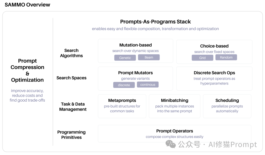 SAMMO是一个通用的Prompt优化框架适用于黑盒设置即优化者只能从LLM的输出中采样。论文证明了SAMMO概括了之前的多种指令优化和压缩技术并在三种不同的应用场景中显著优于现有方法: 1. 指令调优:SAMMO在8个零样本 BigBench 分类任务上分别提升了10%-100%的性能尤其对于较弱的LLM效果更加明显。对于目前解决一些部署问题,这个方案可能是成本最小效果最优的。 2. 检索增强型生成(RAG)管道调优:SAMMO在 GeoQuery、SMCalFlow 和 Overnight 三个数据集上分别提升了26%-133%的准确率即使对于强大的 GPT4 也能带来30%的收益。 3. Prompt压缩:SAMMO能在保持基线性能的前提下将Prompt的加权代价(输入输出长度)压缩超过40%大幅优于其他压缩方法。上下文长度有限的情况下,结构化Prompt压缩后节省的不仅是Token。 此外SAMMO的通用性也体现在它可以兼容之前的多种Prompt优化和压缩方法如自动化Prompt工程(APE)、GrIPS、STDC、Stopwords、GPT-4 Rewrite等作为它们的特例。实验结果表明相比这些方法SAMMO不仅能显著提升性能还能实现更大幅度的Prompt压缩尤其在较弱LLM上效果更加明显。 这些实验结果表明随着LLM越来越强大Prompt的复杂性也越来越高传统的Prompt优化方法已经不再适用。SAMMO通过将Prompt建模为结构化程序提供了一种通用、高效的优化方法不仅可以显著提升 Prompt 性能,还能大幅压缩 Prompt 的开销,对于构建高效的人机交互系统非常有帮助,掌握这个SAMMO方法可以为未来大规模应用LLM奠定坚实的基础。 需要指出的是SAMMO的优化效果会因LLM的不同而有所差异这说明即使使用相同的变异算子不同LLM的Prompt优化轨迹也存在较弱的相关性。因此在实际应用中Prompt优化需要针对具体的LLM single out。但从全面来看,微软的这项SAMMO的确开创了一种新的Prompt优化范式为LLM的大规模应用提供了重要支撑。 项目给出一个示例操作方法和API参考,可以在Github上搜一下SAMMO,这个项目由Tobias Schnabel撰写。