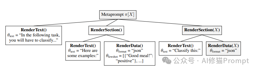 Metaprompt\( \π[X] \):这是顶层节点,表示整个元提示的函数,接受输入 \( X \) 并生成最终输出。 RenderSection():这是两个分支的父节点,负责渲染整个提示的一个部分。 子节点: RenderText() 和 RenderData(X)节点在右侧一起工作,以渲染任务的具体部分,例如提示用户分类输入数据 \( X \),并且以JSON格式展示。 这张图说明了元提示如何将多个组件组合起来,每个组件负责提示的不同部分。通过这样的结构化方法,我们可以针对性地对元提示进行修改和优化,如调整文本说明或者更改数据的格式和示例,进而优化整体的性能。