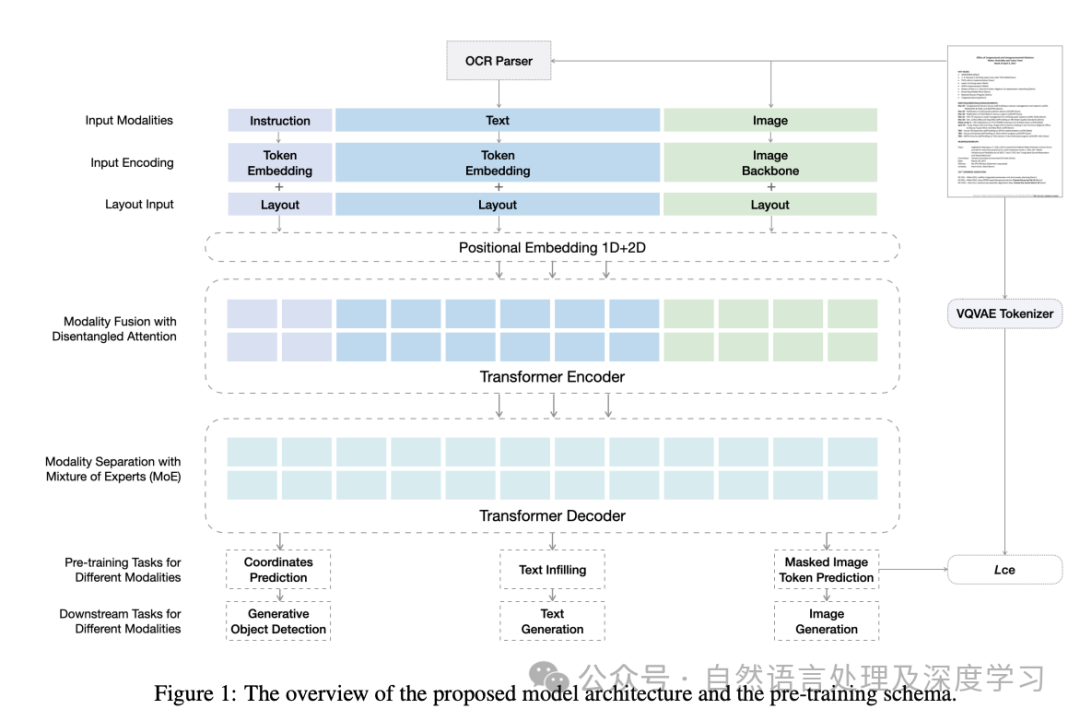 • GenDoc:GenDoc模型采用了编码器-解码器架构,使其能够适应不同输出格式的多样化下游任务。GenDoc的预训练任务包括掩蔽文本预测、掩蔽图像令牌预测和掩蔽坐标预测,以适应多种模态。该模型整合了模态特定的指令、解耦注意力和混合模态专家(MoE)方法,以有效地捕获每个模态的信息。
