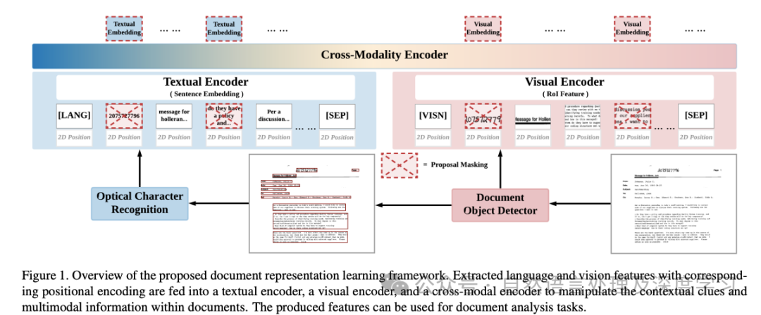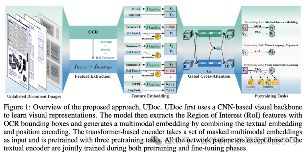 • UDoc:UDoc是一个框架,采用了多层门控交叉注意力编码器,能够在单个模型内实现有效的跨模态交互。与传统方法不同,UDoc考虑了文档的复杂性和多样性,结合了文本和视觉特征。UDoc采用三种预训练任务:掩蔽句子建模(MSM)、视觉对比学习(VCL)和视觉-语言对齐(VLA)。