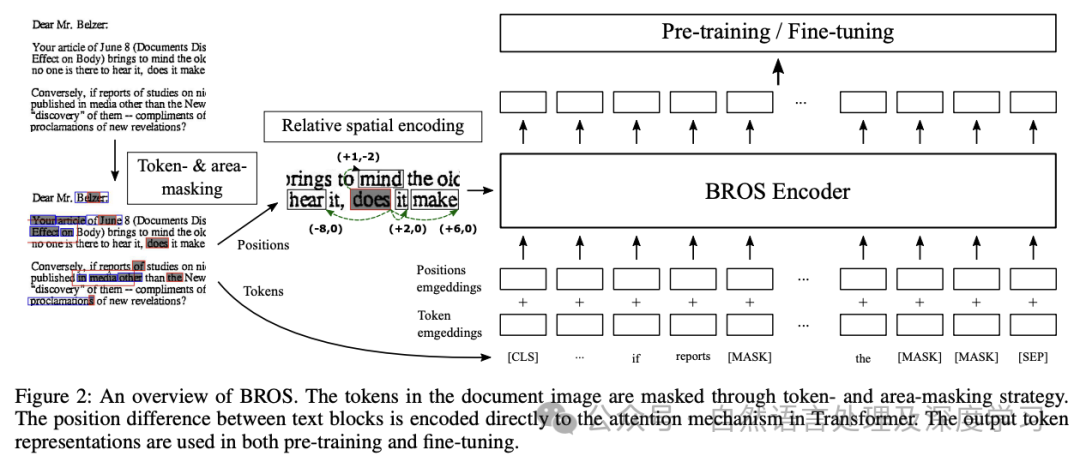 • BROS:BROS模型在预训练时不包含文本图像,而是专注于结合文本和位置信息,忽略布局模态。BROS引入了一个自定义文本序列化器,根据相邻令牌的位置对令牌进行排序。