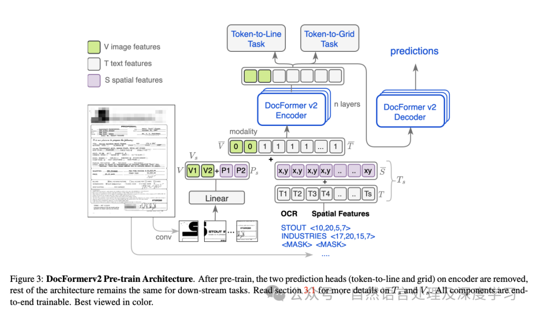 • DocFormerv2:DocFormerv2包含一个专门处理文档的多模态编码器,该编码器能够处理文本内容和文档固有的空间特征。模型采用了创新的预训练任务,如token-to-line和token-to-grid预测,以捕获文档布局和结构。这使得模型能够理解文档元素的空间排列。为了有效地整合来自文档图像的空间信息,作者引入了空间特征,编码了位置、大小和类别等关键元素。