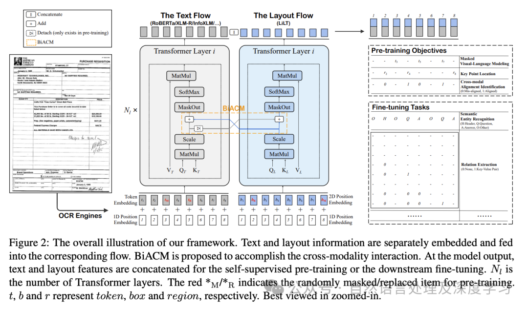 • LiLT(Language-independent Layout Transformer):LiLT是一个新颖的框架,它允许在单一语言的文档上进行预训练,然后针对多种语言进行微调。LiLT的核心架构基于并行双流Transformer模型,有效地处理文本和布局信息。在预训练期间,LiLT解耦文档的文本和布局方面,并采用双向注意力互补机制(BiACM)来促进这些模态之间的交互。然后,模型使用现成的预训练文本模型进行下游任务的微调,确保LiLT能够从单语言文档中学习和泛化布局知识到多语言环境中。