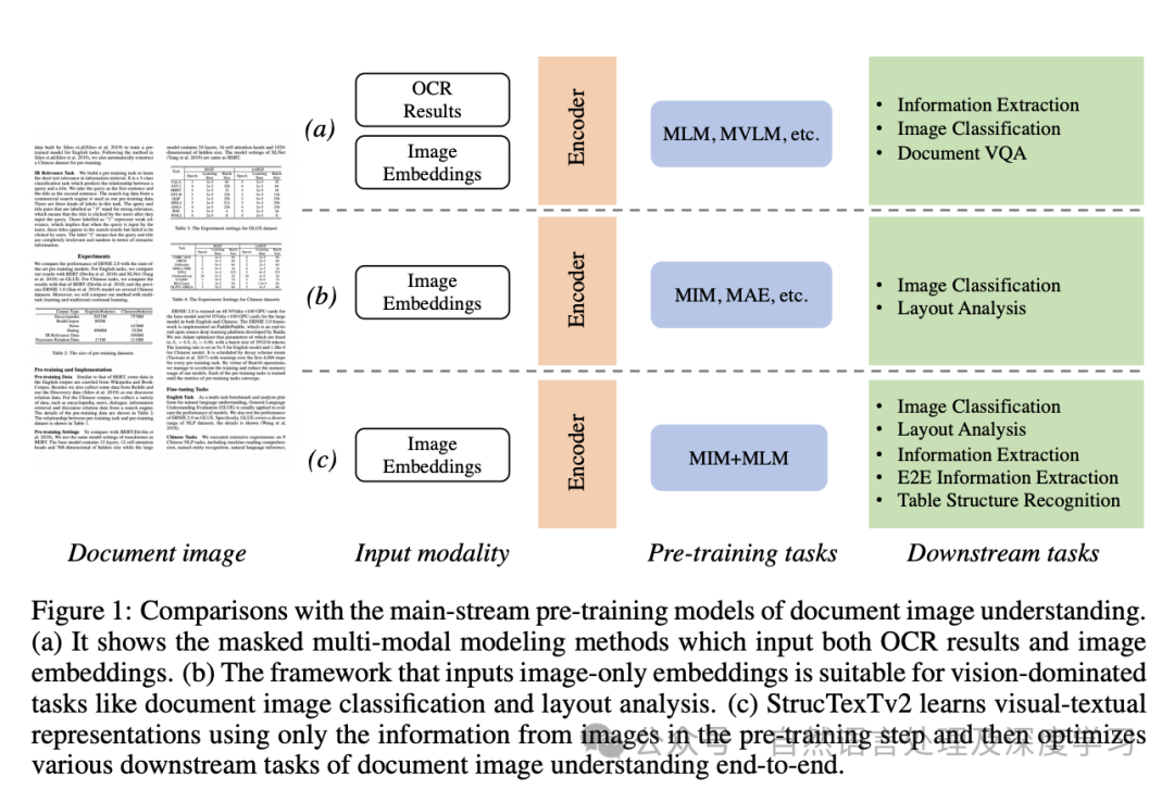 • StrucTexTv2:StrucTexTv2结合了视觉和文本信息,有效地分析文档图像。该模型采用了独特的预训练策略,包括Mask Language Modeling (MLM)和Mask Image Modeling (MIM),利用文本区域级别的掩蔽来预测视觉和文本内容。