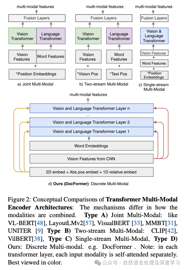• DocFormer:DocFormer通过融合视觉和语言网络层来改进多模态训练。它使用ResNet CNN获取视觉特征,并使用OCR结果对文档图像进行文本嵌入。
