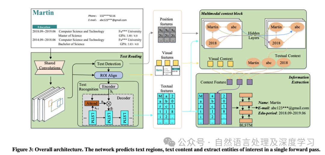 • TRIE:TRIE模型将文本阅读和文本理解任务融合到一个端到端训练的网络中。该模型包含文本阅读模块、多模态上下文块和信息提取模块。文本阅读模块使用ResNet CNN和Feature Pyramid Network (FPN)提取输入图像的卷积特征。这些特征随后被用于确定可能的文本区域。多模态上下文块融合文本、位置和视觉特征。信息提取模块使用这些特征来分离实体并提取它们的值。
