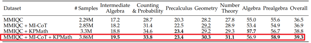 KPMath-Plus数据集在KPMath的基础上整合了其他数据源,如MMIQC和MathInstruct-CoT。如下图所示:KPMath-Plus数据集的生成涉及数据清洗和格式化,以确保数据集的一致性和完整性。最后,对整合后的数据集进行优化,平衡不同主题和关键点的分布,形成最终的KPMath-Plus数据集。这个数据集不仅包含了KPMath的所有内容,还额外包含了其他数据源的信息,为模型提供了更全面的数学推理训练材料,有助于提升模型在解决复杂数学问题方面的能力。