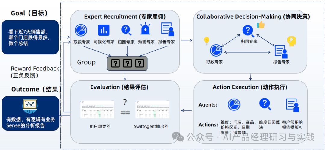 这四种代理设计模式为AI产品的设计和开发提供了新的思路和方法。作为AI产品经理,我们需要深入理解这些模式的原理和应用,以便将它们融入产品创新中,不仅解决用户的现有问题,也为用户探索未来可能的需求。同时,通过这些模式,我们还可以更好地理解人工智能的潜力和局限,制定出更合理的产品规划和发展战略。 反思模式让AI能够自我评估和改进,这对于构建更智能、更自适应的产品至关重要。作为AI产品经理,我们可以利用这一模式设计出能够在收到用户反馈后自我优化的系统,从而减少持续监督的需要,并提升产品随时间的改进速度。 工具使用模式拓展了AI的能力边界,使其能够执行网络搜索、代码执行等操作,从而处理更复杂的任务。这种模式的应用使得我们的AI产品不再局限于事先编码的知识,而是可以动态地访问和利用外部资源,以解决用户面临的实时问题。 规划模式为AI系统提供了制定和执行多步计划的能力,这对于那些需要执行复杂任务或决策过程的产品来说,是一个巨大的进步。通过这种模式,AI不仅能够更有效地完成任务,还能为用户提供更加连贯、逻辑性更强的互动体验。 多代理合作模式则开辟了AI技术合作的新领域。通过让不同的AI代理协同工作,我们可以解决单一代理无法处理的复杂问题,或是在创造性任务中产生更多创新的解决方案。作为产品经理,利用这一模式可以开发出团队协作工具、创意生成平台等多种产品,极大地扩展了AI的应用场景。 说到这,我又忍不住说说之前看到关于AI+BI(因为这也是我重点研究的领域啊,见《结合大语言模型实现对话式的智能报表系统》)也采用了多代理合作模式的一个设计,深得我心:  不过,我们也必须认识到实施这些先进技术时所面临的挑战和风险:反思模式:虽然反思模式使AI能够自我评估和改进,提升了模型的自适应性,但这也带来了新的挑战。例如,AI可能会在不恰当的反馈循环中陷入过度优化,导致过拟合或失去对原始任务的关注。此外,自我反思的过程可能会引入意料之外的偏差,特别是当评估标准不完全明确或与人类价值观不一致时。工具使用模式:它极大地扩展了AI的能力,但同时也增加了系统的复杂性。集成外部工具和服务需要精确的控制和错误处理机制,以防AI执行不当的操作或获取不准确的信息。此外,对外部资源的依赖也可能带来隐私和安全方面的风险,需要产品经理仔细考量数据处理和用户信息保护的合规性问题。规划模式:尽管它为AI提供了制定和执行复杂策略的能力,但在动态或不确定的环境中,制定有效的多步骤计划仍然是一个挑战。AI的规划能力可能因缺乏对环境变化的适应性或理解不足而受限。此外,过度依赖预先规划的路径可能导致缺乏灵活性,无法应对突发情况。多代理合作:虽然多代理合作模式提供了解决复杂问题和促进创新的潜力,但代理间的有效协调和沟通是一大挑战。不同代理的目标、策略和优先级可能不一致,导致效率低下或冲突。此外,设计一个能够公平、有效分配任务并评估各代理贡献的系统,也是一项非常复杂的任务。