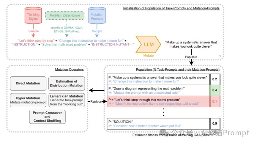 ingFang SC", "Hiragino Sans GB", "Microsoft YaHei UI", "Microsoft YaHei", Arial, sans-serif;text-wrap: wrap;background-color: rgb(255, 255, 255);"> 1. 初始化:首先,PROMPTBREEDER会根据问题描述,生成一组初始的任务提示和变异提示。这些提示是通过随机组合一些"思维模式"(如"逐步思考"、"以有趣的方式表述")和问题描述而得到的。
