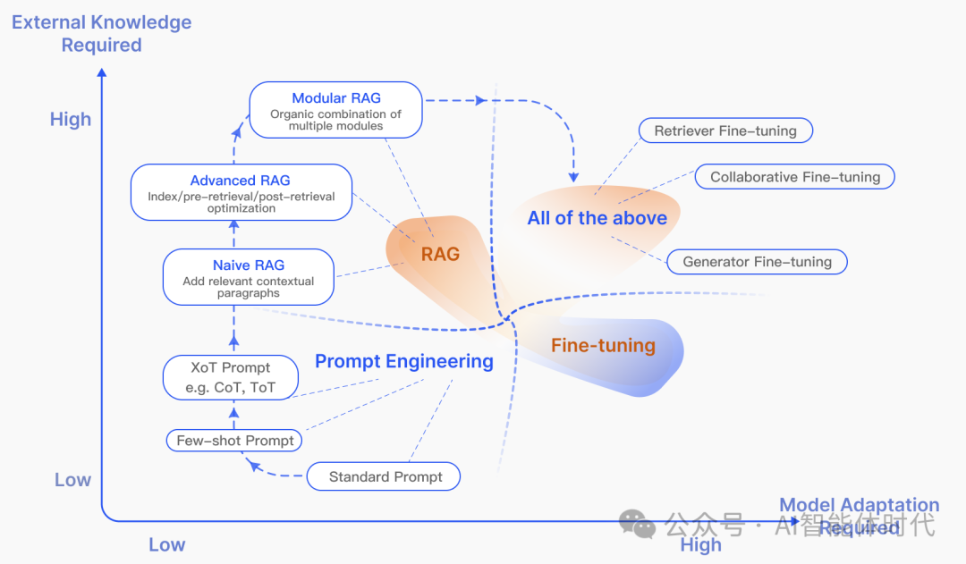 RAG经常与微调(Fine-tuning)、提示工程(prompt engineering)技术进行比较。如下图所示,从External Knowledge(外部知识)和Model Adaptation(模型适应)两个角度来说明这三种方法的差异。