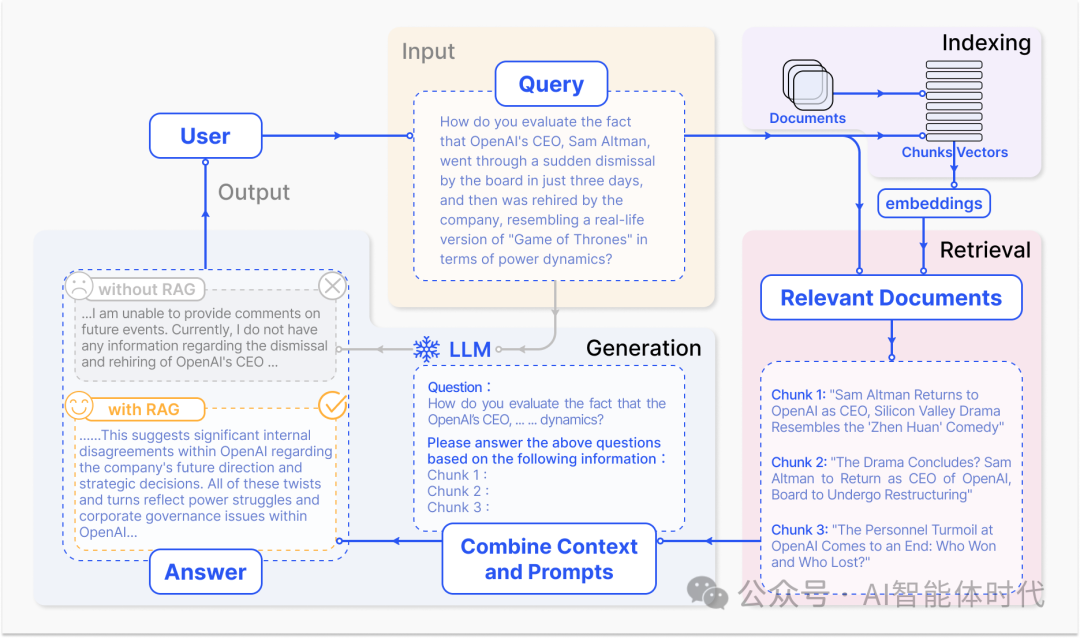 而RAG通过从外部数据获取和整合知识来弥补信息差距(收集与用户问题相关的新闻),这些文章与用户问题相结合形成了全面的上下文,使LLMs能够生成更为准确的回答。(蓝色流程)