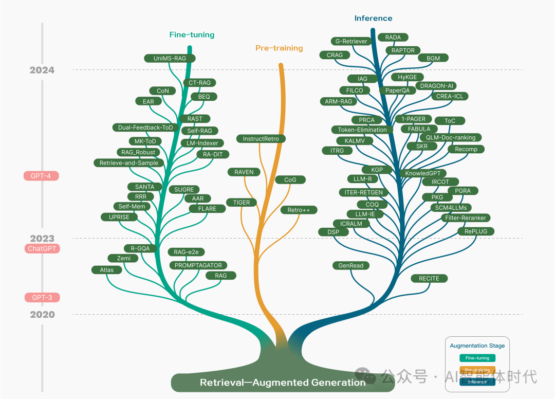 RAG的发展历程包括预训练(pre-training)、微调(fine-tuning)及推理(inference)。