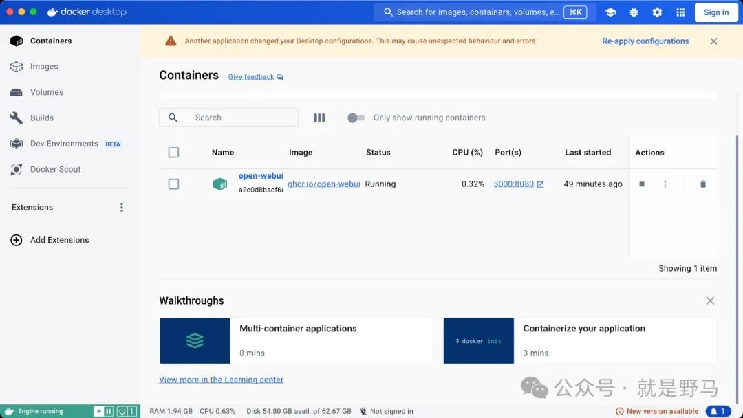 下载好后,打开docker客户端,能看到Open WebUI项目,点击Port下的端口号