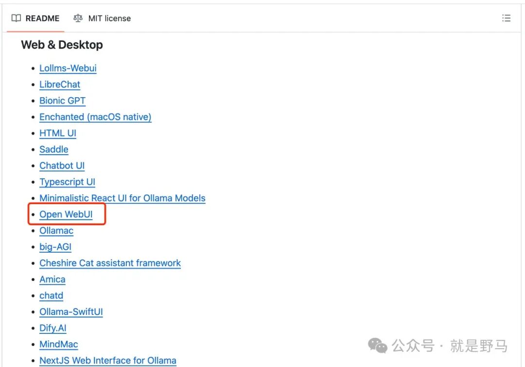 完成docker下载后,我们去ollama的github中选一个开源的webUI项目,我这里以Open WebUI为例