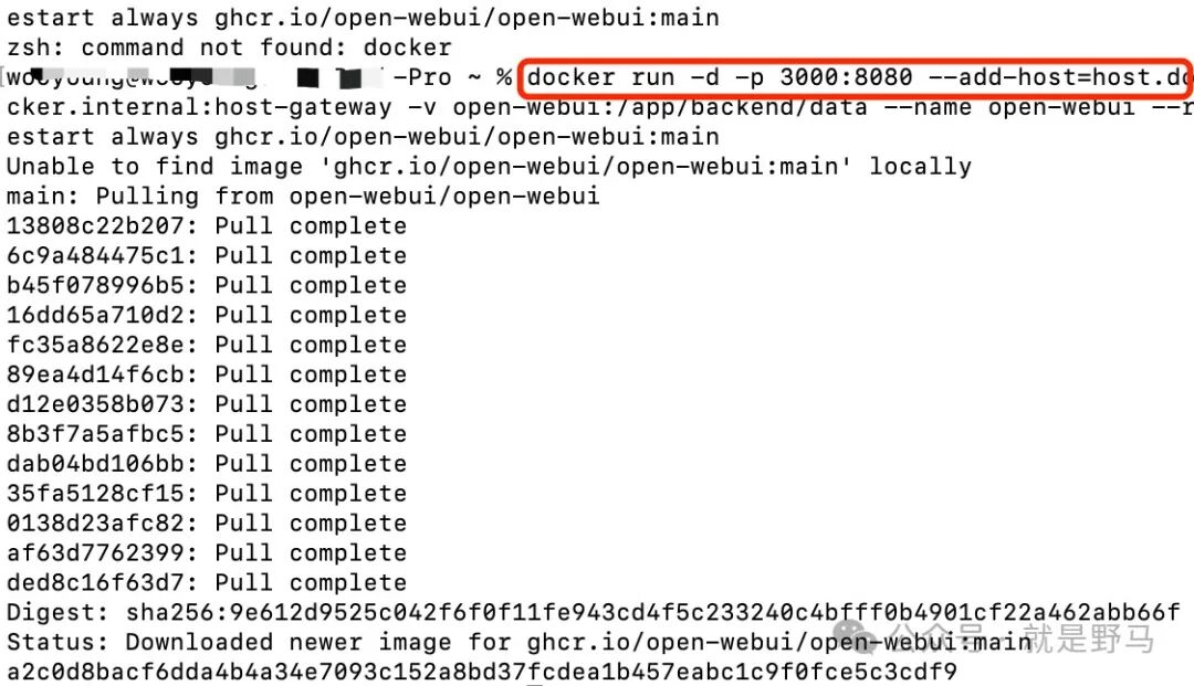 打开电脑的命令行终端,将这段代码复制并运行,能看到docker开始下载webUI项目了