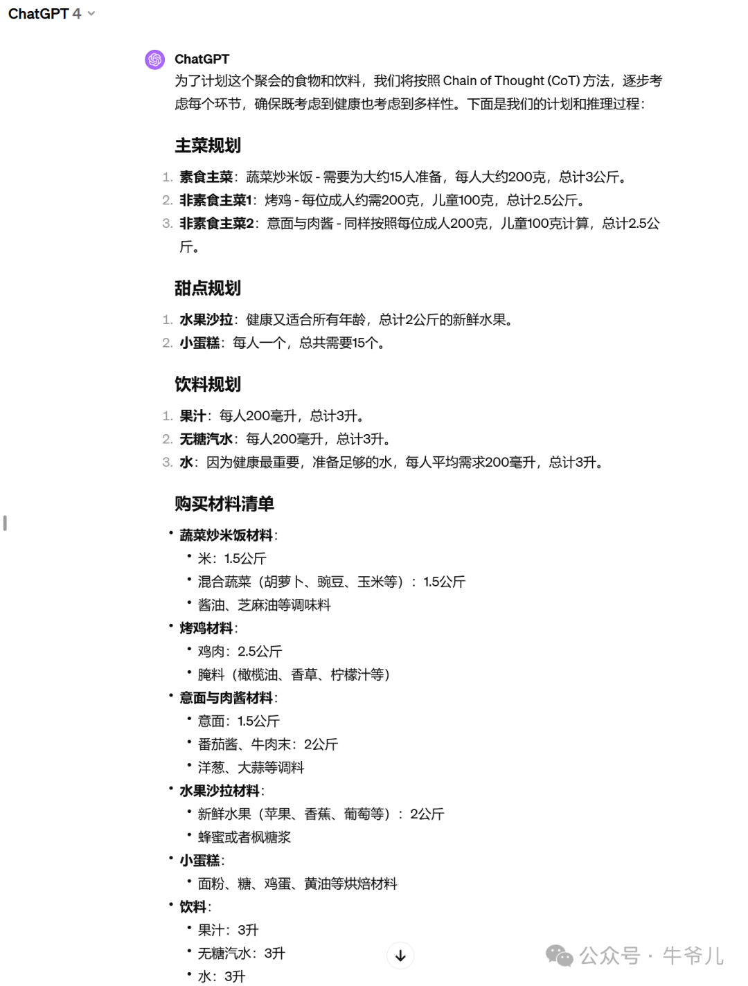 现在,我们将上述 Chain of Thought 过程转化为具体的 AI 任务指令(prompt):"请为一个包含10位成人和5位儿童的周末聚会规划食物和饮料。需要三种主菜,确保既有素食也有非素食选择,两种适合所有年龄的甜点,以及三种健康饮料选项。考虑到成人和儿童的偏好,以及确保健康和多样性。估算所需的总量,并准备一个购买材料的清单。"