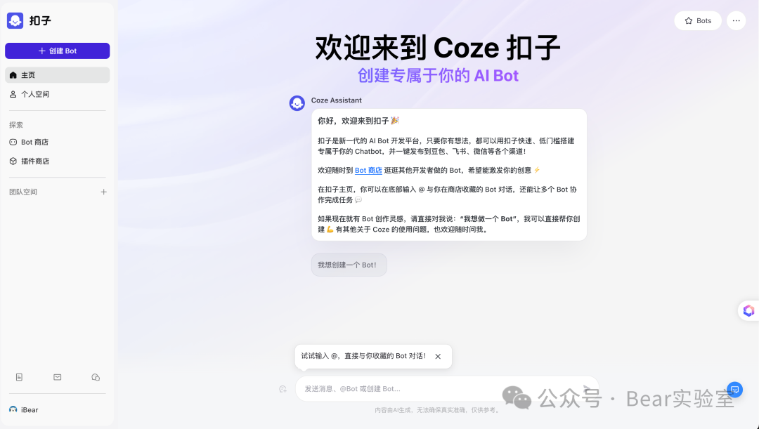 扣子是新一代一站式 AI Bot 开发平台。无论你是否有编程基础,都可以在扣子平台上快速搭建基于 AI 模型的各类问答 Bot,从解决简单的问答到处理复杂逻辑的对话。而且你可以将搭建的 Bot 发布到各类社交平台和通讯软件上,让更多的用户与你搭建的 Bot 聊天。