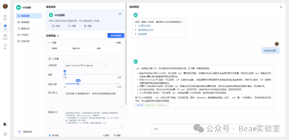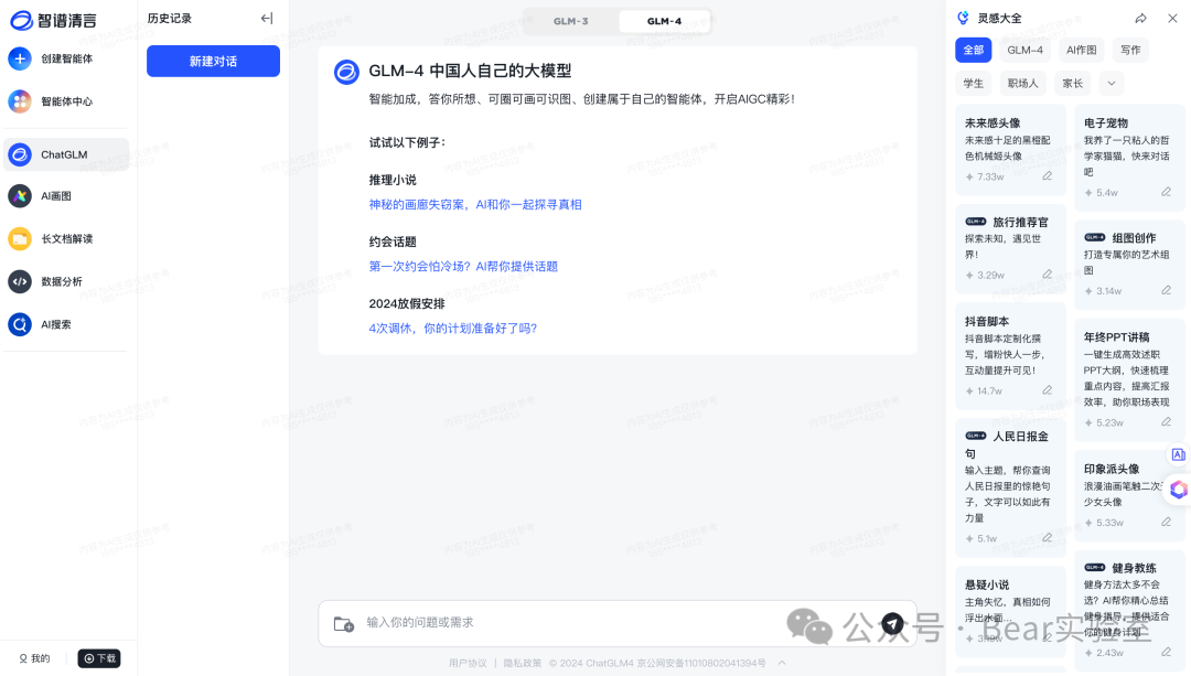 这款国产的定制版Agent生成器中,用户只需要用自然语言输入Agent功能,GLMs就会自动生成应用名称、配置名称、模型能力调用等配置文件信息。用户还可以上传外部知识库,让GLMs进行学习。