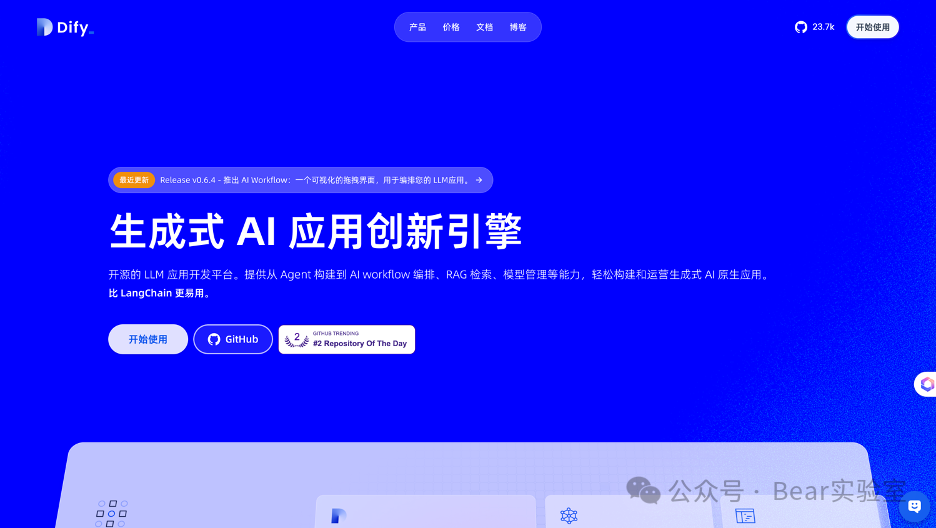 Dify是一款开源的大语言模型(LLM) 应用开发平台。它融合了后端即服务(Backend as Service)和 LLMOps的理念,使开发者可以快速搭建生产级的生成式 AI 应用。即使你是非技术人员,也能参与到 AI 应用的定义和数据运营过程中。