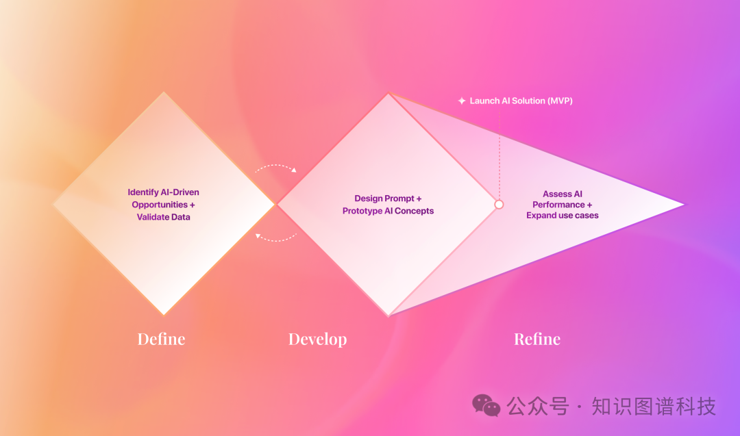 让我们简要审视以上列出的每个步骤: 定义:此初步阶段致力于确定产品的核心领域、优先考虑基于人工智能的机遇、确定数据来源,并明确旨在解决的用户问题和目标* 开发:随后的阶段涉及多样的数据集收集、设计提示的创建、概念的原型制作以及初步人工智能解决方案的部署——这对于发现真实数据和交互模式至关重要。 完善:棱形模型的扩展阶段通过评估人工智能性能、执行用户研究活动和迭代改进设计进一步拓宽了用例。
