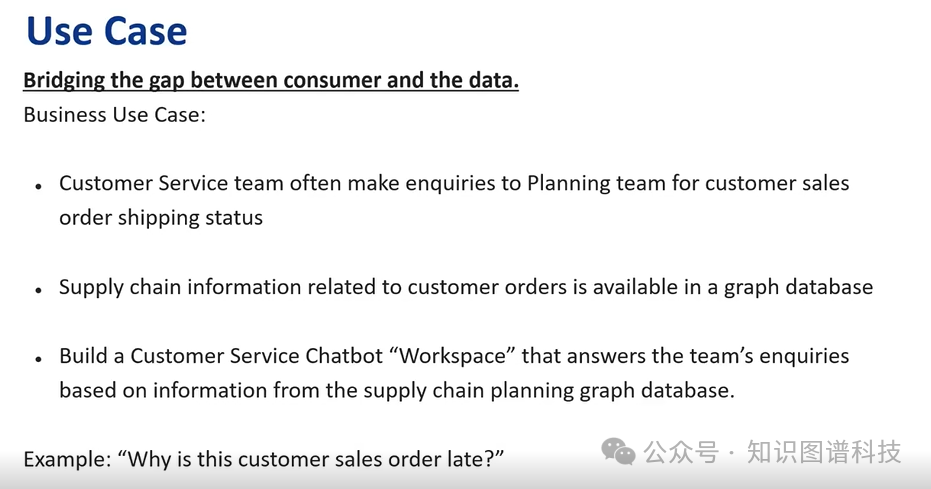 他强调了一个客服聊天机器人,利用知识图谱快速提供有关客户订单和物流的详细准确信息,提高服务效率和客户满意度。