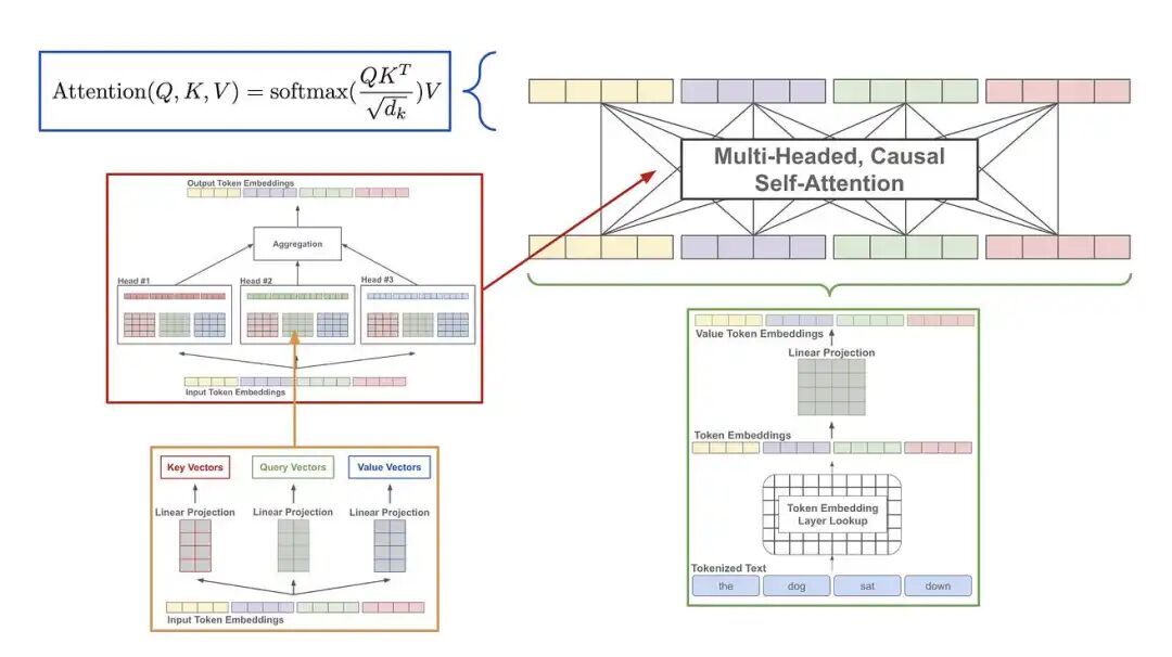 注意力机制的关键在于,使用一个查询向量与序列中所有其他标记的键向量进行比较,以判断它们之间的相关性。这个过程在序列中的每个标记都可以并行计算,速度快,效果好。