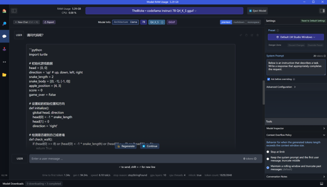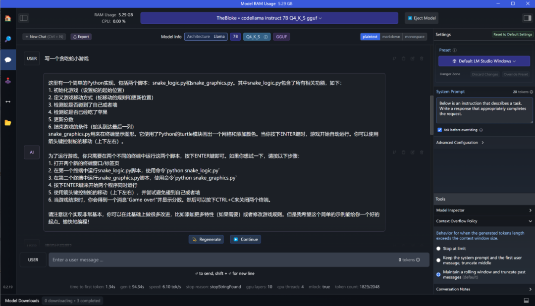 切换到codellama模型让它帮我写一个贪吃蛇游戏: