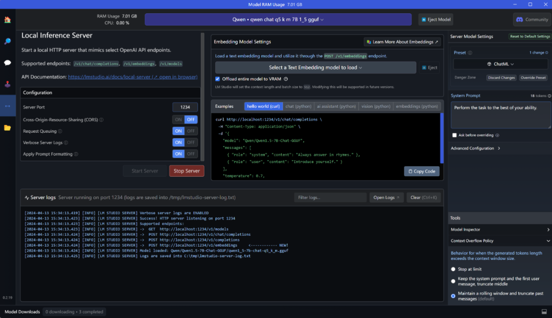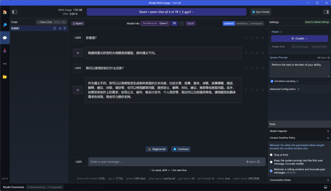 LM Studio还有一个使用 Multi Model 模式,通过加载多个模型来一起工作,因本地RAM限制这里就不做尝试了。