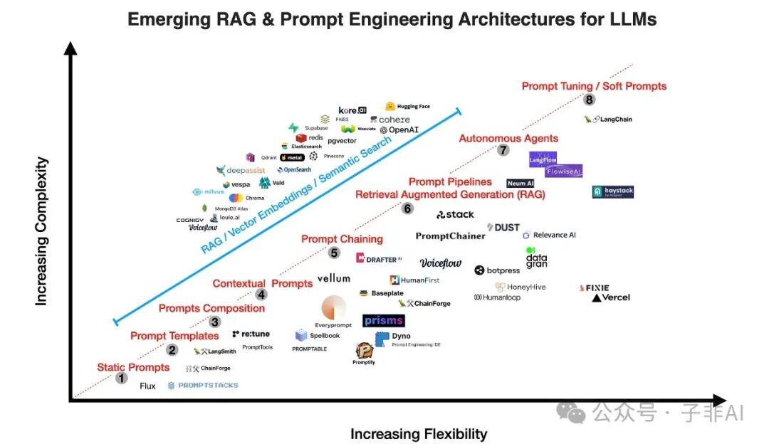 总的来说,在不断发展的语言模型、工具和应用的格局中,下图展示了语言模型工程的演进过程。沿着 x 轴,灵活性不断增强;沿着 y 轴,复杂性逐渐上升。这张图为开发人员、研究人员和公司提供了宏观视角,展示了他们所面临的选择和挑战。