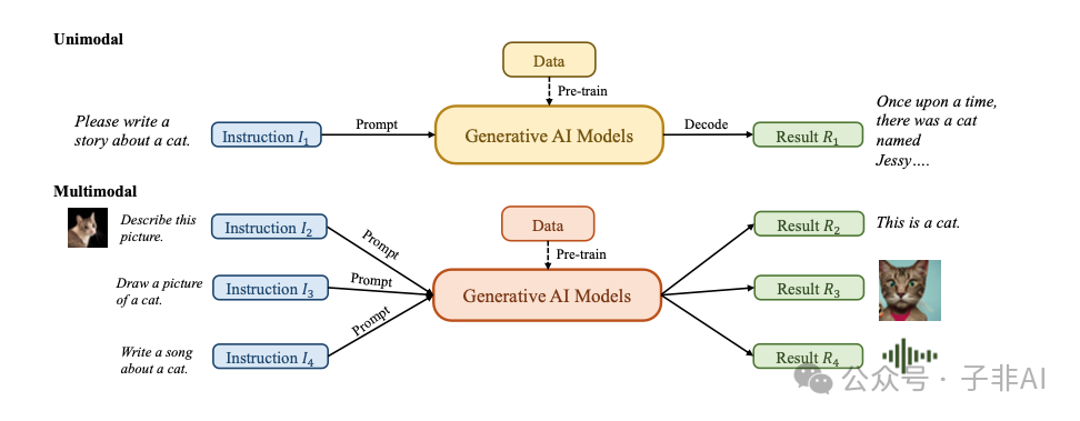 在生成式AI(GAI)领域,模型通常可分为两类:单模态模型和多模态模型。单模态模型通过使用与生成内容相同类型的数据来提供指令,而多模态模型则能够从一种类型的数据接收指令并生成另一种类型的内容。下图说明了这两类模型。