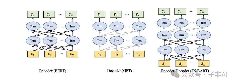 编码器-解码器模型(如T5和BART),合并了两种方法。这些模型使用上下文感知结构作为编码器,使用左至右结构作为解码器。