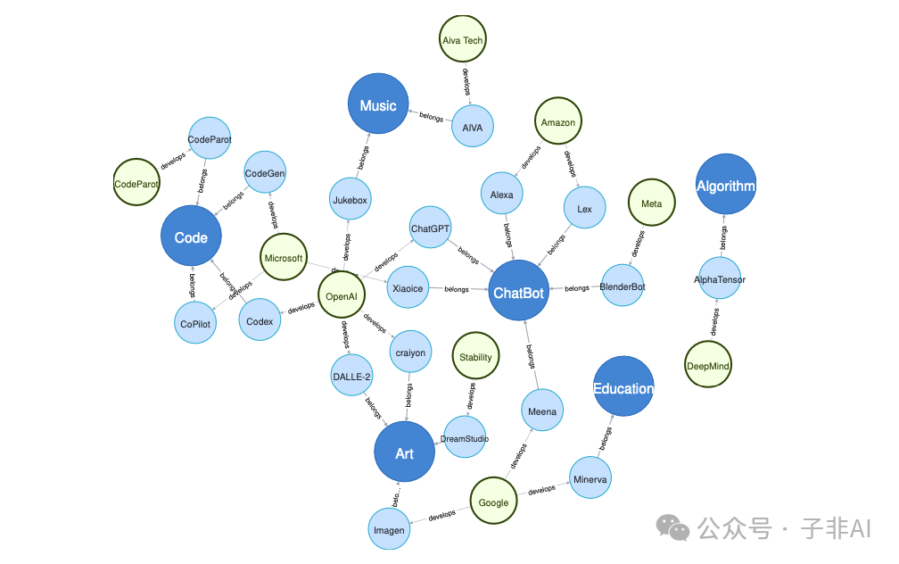 该知识图谱说明了当前研究领域、应用和相关公司之间的关系。研究领域由深蓝色圆圈表示,应用由浅蓝色圆圈表示,公司由绿色圆圈表示。