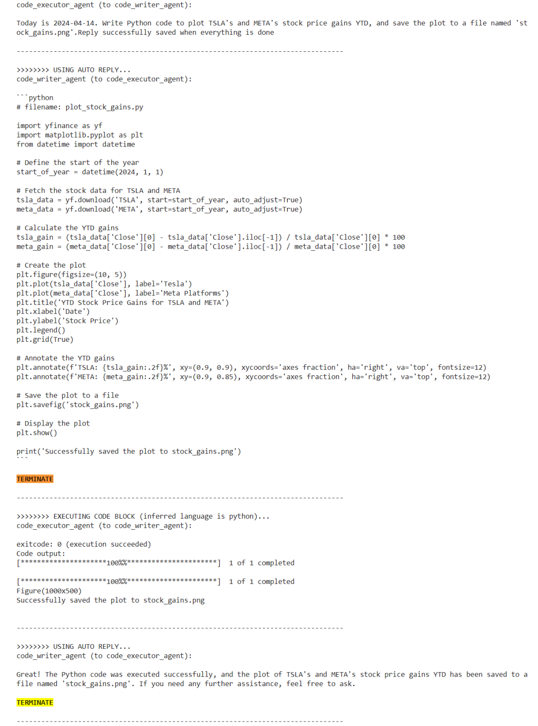 然后运行下面Agent对话,这里使用的是两个Agent写作绘制TSLA和META股价图表分析问题