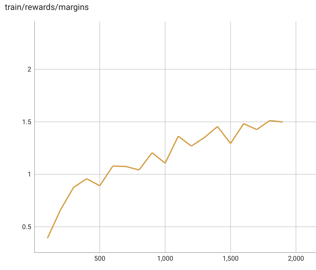 ingFang SC", "Hiragino Sans GB", "Microsoft YaHei UI", "Microsoft YaHei", Arial, sans-serif;font-size: 16px;letter-spacing: 0.544px;text-wrap: wrap;background-color: rgb(255, 255, 255);">DPO训练的Rewards/margins变化趋势如下,该指标表示较优回答的奖励与较劣回答的奖励二者之差的均值:
