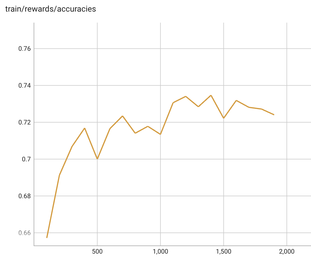 ingFang SC", "Hiragino Sans GB", "Microsoft YaHei UI", "Microsoft YaHei", Arial, sans-serif;font-size: 16px;letter-spacing: 0.544px;text-wrap: wrap;background-color: rgb(255, 255, 255);">DPO训练中的Rewards/accuracies的变化趋势如下,该指标表示较优回答的奖励大于较劣回答的奖励的频率的均值: