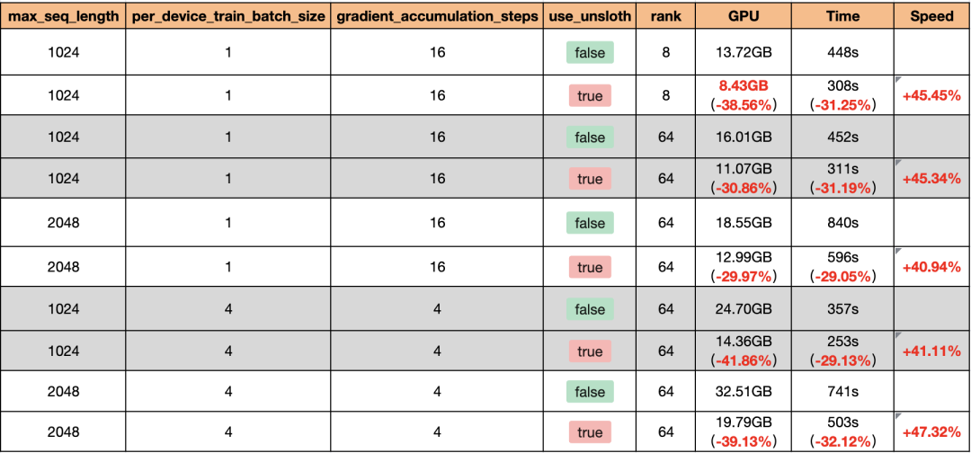 结合QLoRA与Unsloth训练Qwen1.5-7B,最少仅需8.43GB显存开启Unsloth后,Qwen1.5-7B的训练速度可提升47.32%,训练时间可减少32.12%,显存占用可减少39.13%