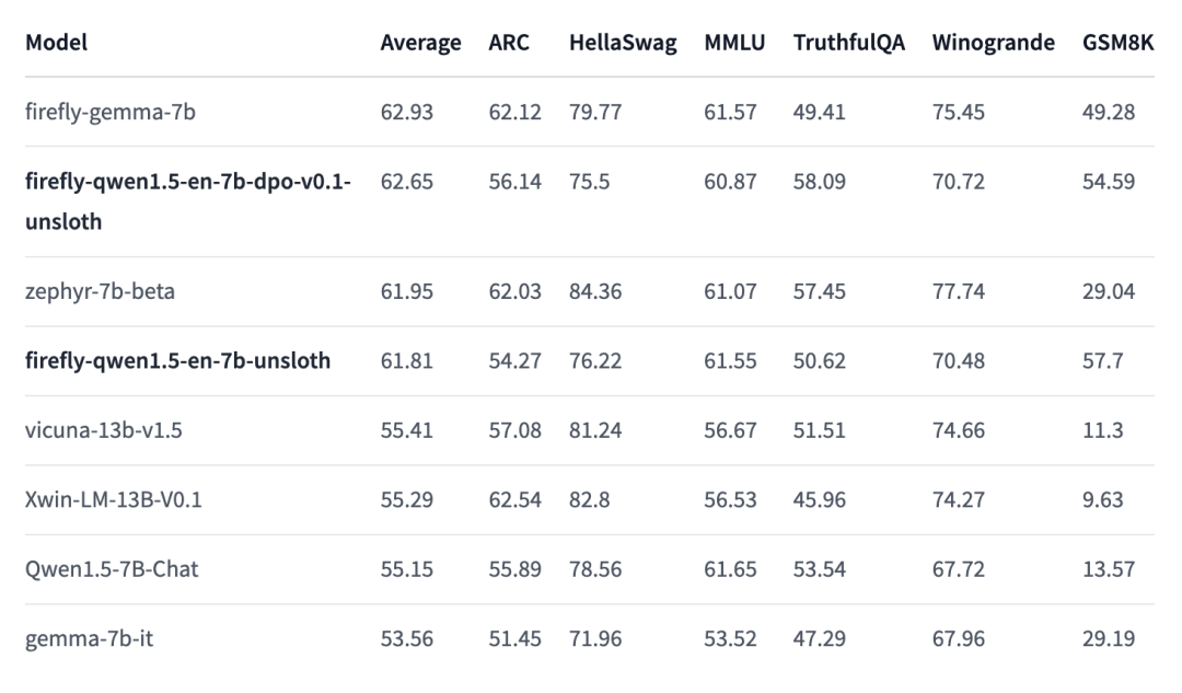 基于上述现状,Firefly项目组尝试对Unsloth进行扩展,使其能够支持Qwen2模型进行训练,并且我们取得了不错的效果。在训练测试中,Qwen1.5-7B最少仅需8.43GB显存,这意味着我们可以在一张1080Ti上训练Qwen1.5-7B。开启Unsloth后,Qwen1.5-7B的训练速度可提升47.32%,训练时间可减少32.12%,显存占用可减少39.13%。我们在?Open LLM Leaderboard中验证了模型和训练方法的有效性,更多详情见第三节。