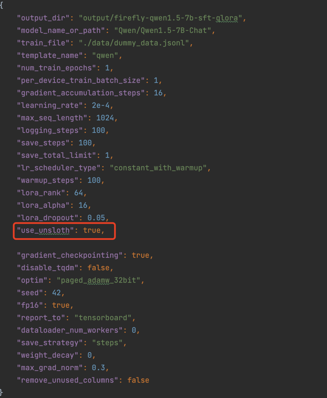 在Firefly中启动Unsloth训练Qwen2,仅需在原来的训练配置文件中将use_unsloth设为true即可,use_unsloth默认为False。